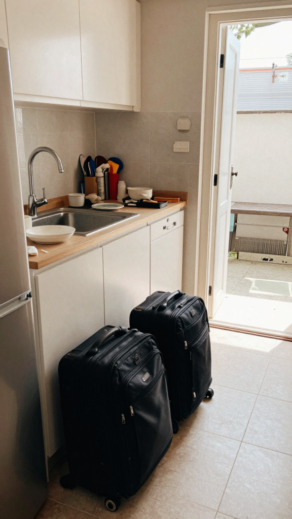 The bags were packed, shoes by the door, and somehow the kitchen still looked like it had plans to betray me. A few dishes in the sink, random food in the fridge, crumbs I pretended not to see.