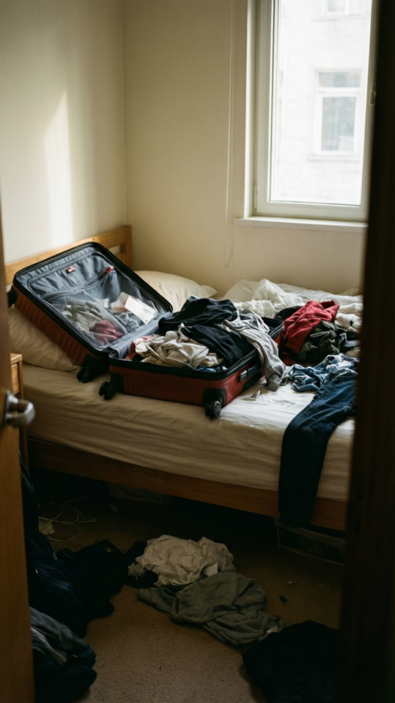 The suitcase sat open on the bed, but the apartment looked like it had already been through a storm. Clothes everywhere, dishes in the sink, random things left out like I was planning to come back in five minutes.
