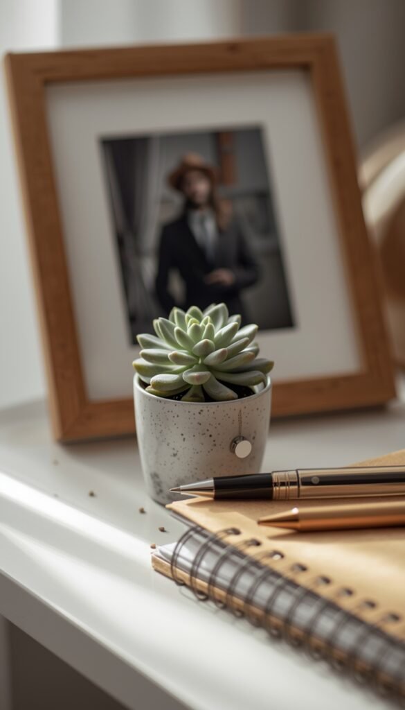 A photo, a small art print, or even a motivational quote can boost your mood without being distracting. I keep mine simple: a tiny frame of my daughter and a daily goal note.